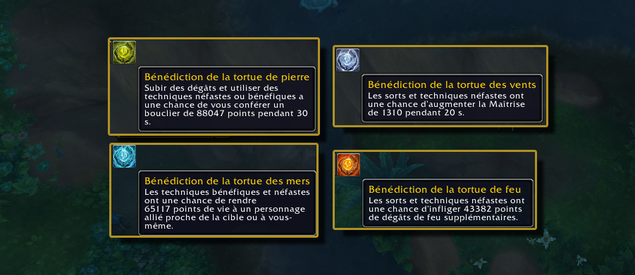 - Bénédiction de la tortue des vents : Les sorts et techniques néfastes ont une chance d’augmenter la Maîtrise de 1.310 pendant 20 secondes.