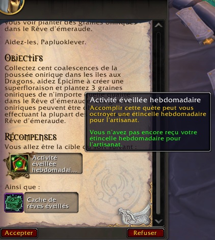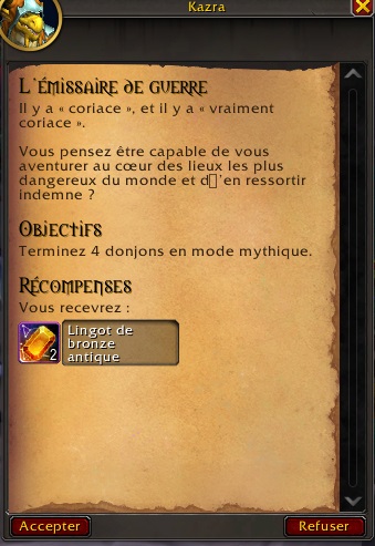 Cette fameuse quête qui nous récompense d’un objet de raid version héroïque après avoir accompli 4 donjons Mythiques (souvent accompli en MM0 et souvent 4 fois le même donjon, coucou les Bassins, le Gueule des Âmes, etc..).