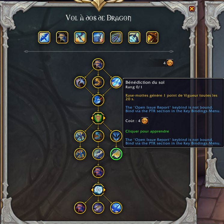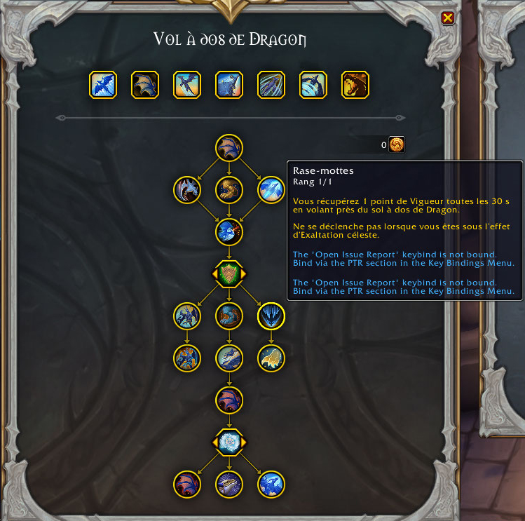 - Rase-mottes : Vous récupérez 1 point de vigueur toutes les 30 secondes en volant près du sol à dos de dragon. Ne se déclenche pas lorsque vous êtes sous l’effet d’Exaltation Céleste.
