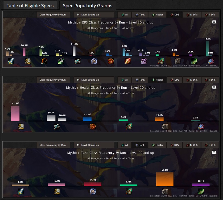 We will have a Break the Meta Leaderboard that you can use to keep track of your progress throughout the event. It will only show BTM-Eligible runs: Timed Runs that are made up entirely of the eligible specs listed below. You can also filter the Leaderboard by all of the usual selections, such as Regions, Brackets, Factions, etc. Keep an eye out on our Twitter and Discord for the link!