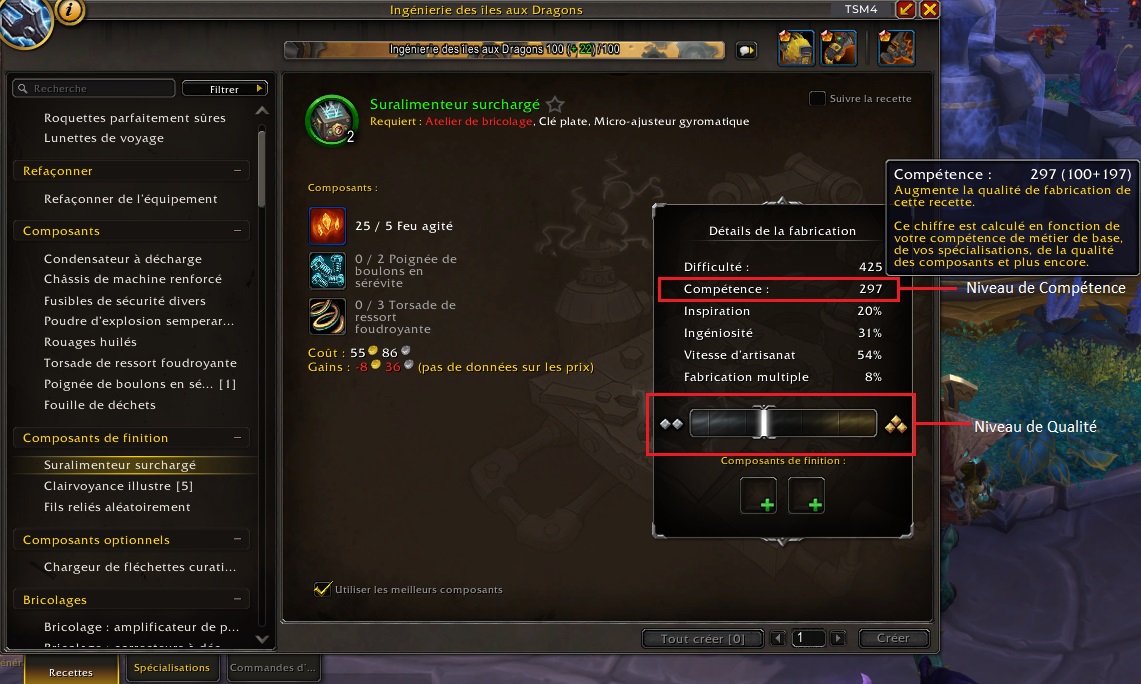 Pour finir, en plaçant le curseur de la souris sur la jauge de qualité, on constate qu’il nous faut un niveau de Compétence d’au moins 32 pour fabriquer cet objet en qualité 4.