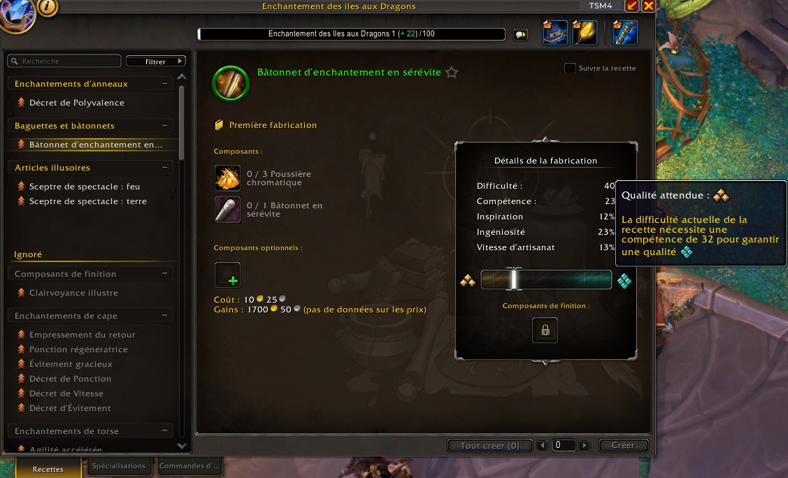 En reprenant l’exemple utilisé dans la partie “Compétence”, on sait donc qu’on a bsoin d’un niveau de Compétence de 32 pour fabriquer le Bâtonnet d’enchantement en sérévite en Qualité 4 et de 40 pour la Qualité 5.