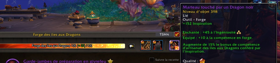 Les meilleurs équipements de métier sont d’ordinaire de qualité rare (bleu). Néanmoins, il existe quelques exceptions, comme la Forge et la Couture à Dragonflight, où vous pouvez obtenir un accessoire ou un outil de qualité épique avec un bonus supplémentaire.