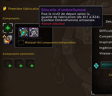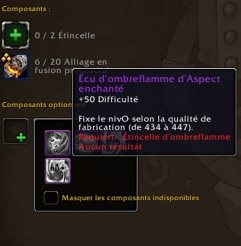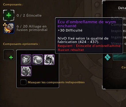 - Écu d’Ombreflamme de wyrm enchanté : +30 difficulté. NivO d’objet fixé selon la qualité de fabrication (424-437)