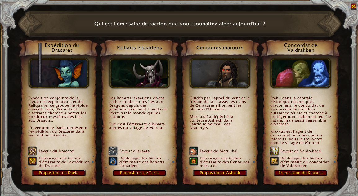 Vous pourrez choisir un émissaire par jour afin de débloquer un bonus de 10% à la réputation choisie, à savoir Expédition du Dracaret, Centaures Maruuk, Roharts Iskaariens et Concordat de Valdrakken.