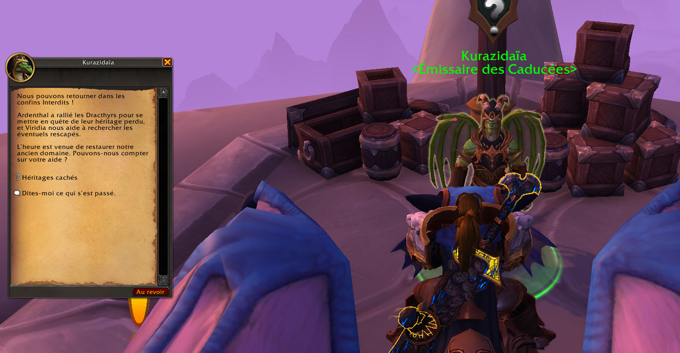 Tout commence au sommet de la tour des aspects de Valdrakken où l’émissaire des Caducées, Kurazidaïa, vous y attend pour y rendre la quête Héritages cachés.