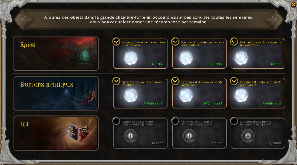 Au reset de la semaine, Mercredi à 05h, vous pourrez choisir de déverrouiller un seul des coffres débloqués et ainsi récupérer la récompense correspondante.