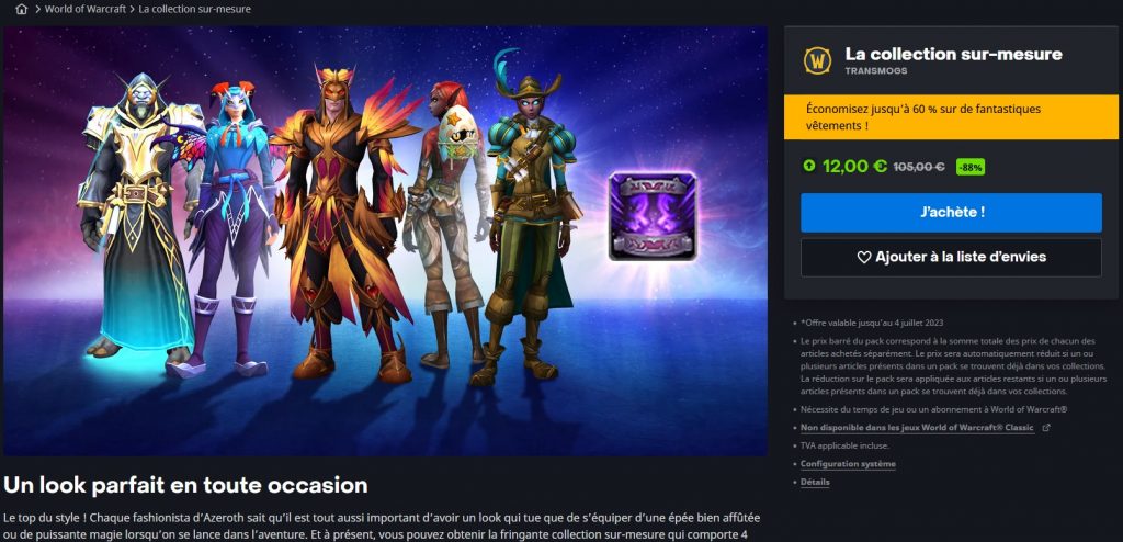 - Les Transmogs : -50% sur l’ensemble des transmogs. -67% sur la Collection Couture (pack adaptable à votre collection)