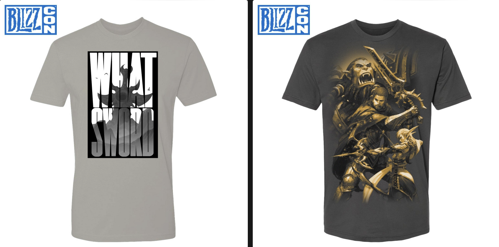 Deux T-Shirt What Sword et The War Within (Key Art), portés à la Blizzcon par l’équipe Blizzard dont Ion Hazzikostas sont en vente sur le Blizzard Gear Store !