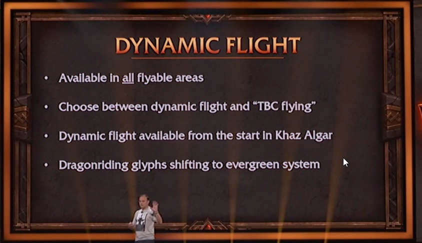 Le directeur du jeu Ion Hazzikostas a confirmé, lors de la Blizzcon 2023, la possibilité d’utiliser le Vol Dynamique (ou Vol à Dos De Dragon) dans toutes les zones où l’on peut voler.